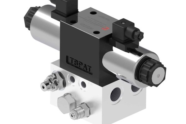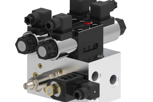 The example shown is a valve control for the operation of two services from two separate pump supplies. The most typical application is for the control of two drive motors on a piece of mobile machinery. Each side of the valve circuit has a normally open safety unloader adding an extra level of protection to prevent unwanted operation / pressurisation of the hydraulic circuit. Valve sizing and optimised manifold design ensures that hydraulic efficiency is uncompromised with lower heat generation being seen in comparison to other market solutions. Cetop directional valves are specified separately, it is recommended that open centre (all ports open in neutral) or figure 4 (P blocked, A & B to T in neutral) spools are used.